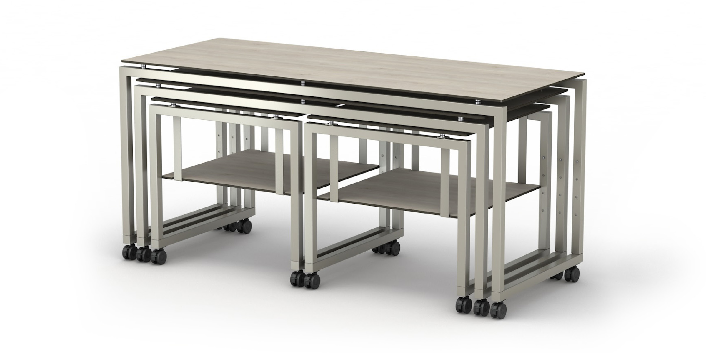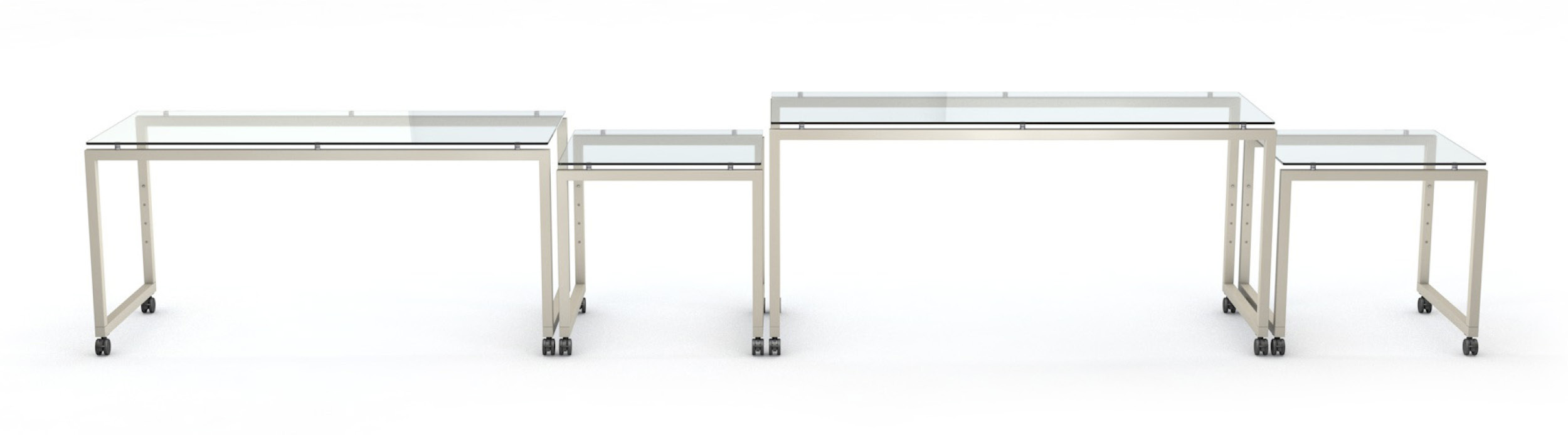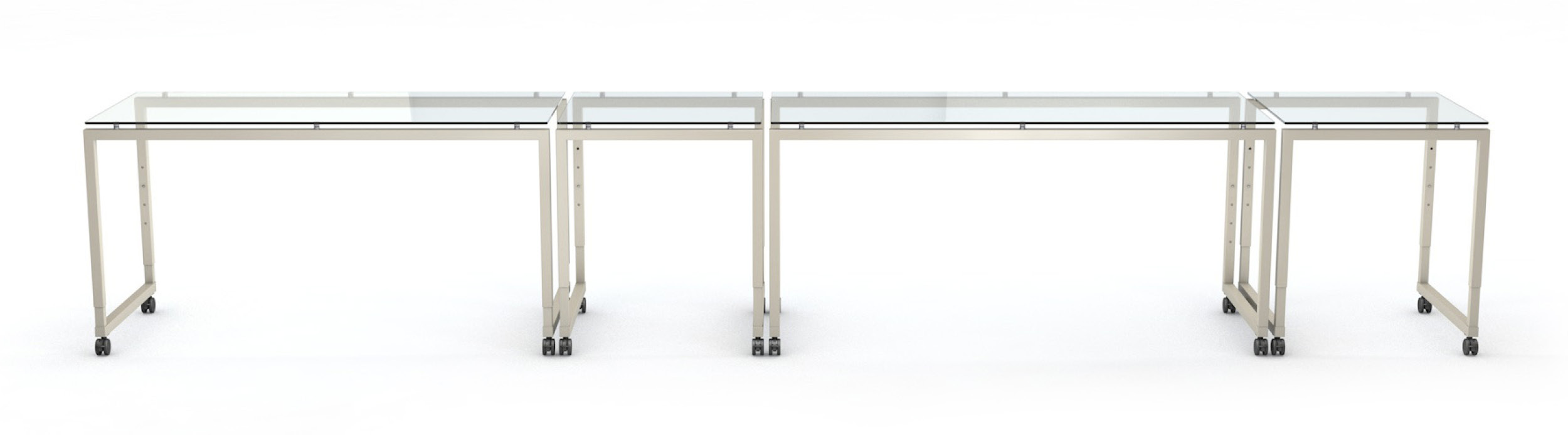 Each STAGE table is equipped with castors, which are an essential advantage for practical use. This allows the tables to be moved easily in the room and to quickly combine many different setups. The tables are available in three different castor sizes:
